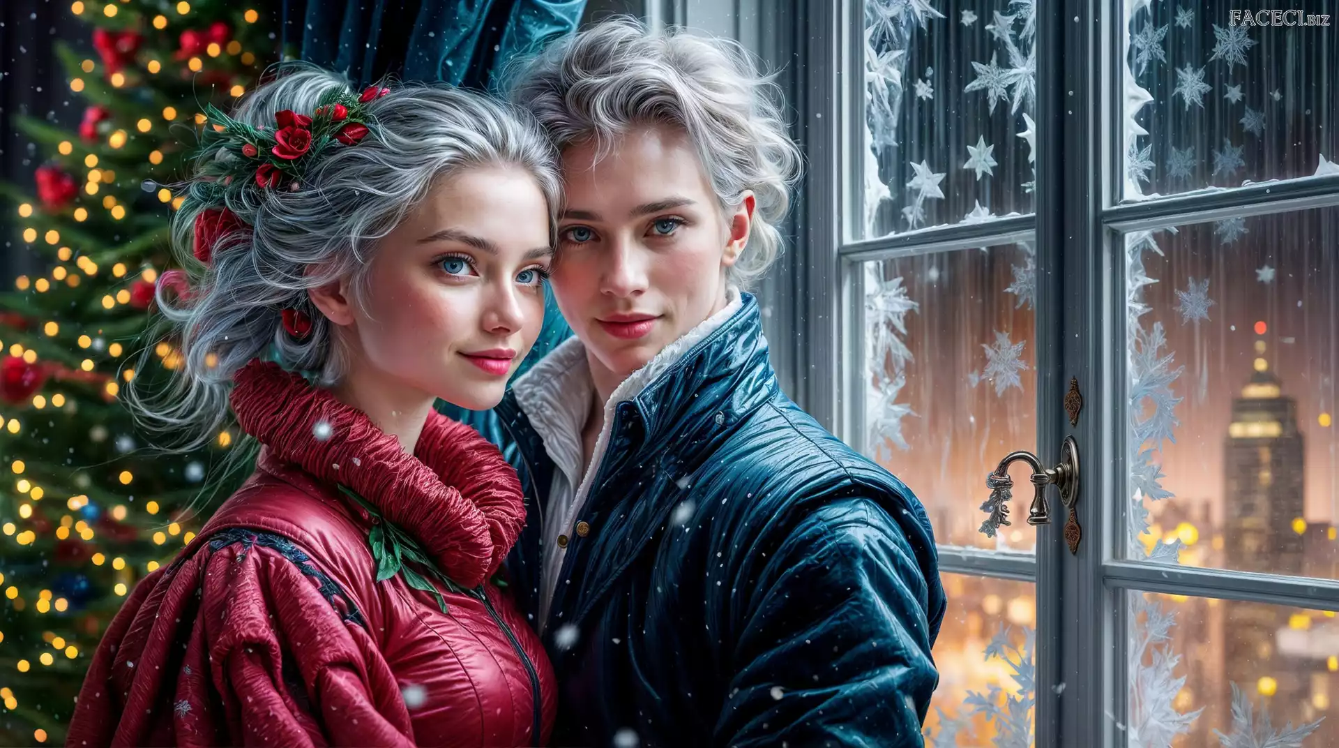 Okno, Choinka, Grafika, Kobieta, Mężczyzna - faceci.biz